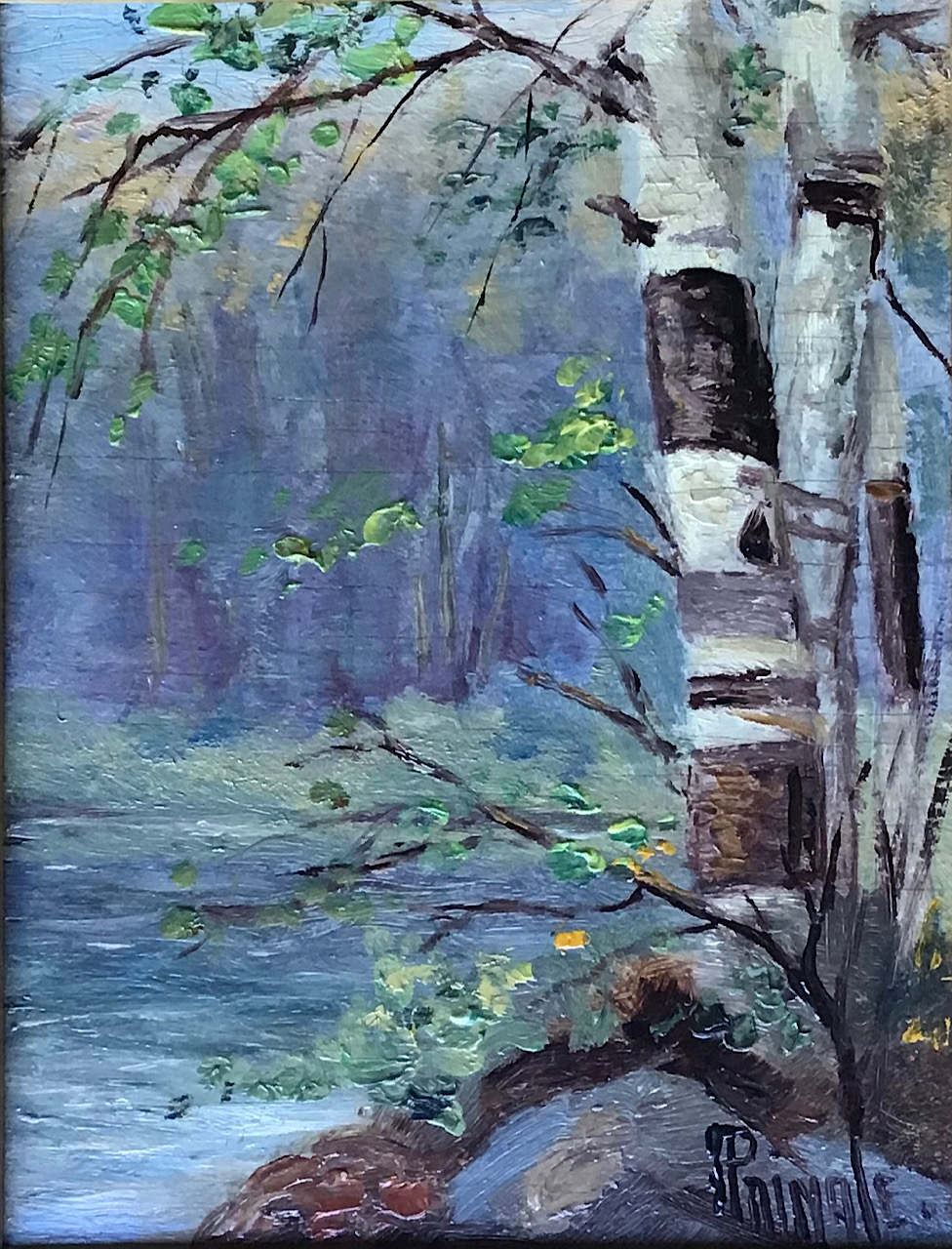 I did some of the shopping though Aunt Peggy did it weekly. My trip to the grocer consisted mainly of fish and pastries –probably because my aunt didn’t approve and made sure that rolled oats was always available for the morning porridge. My grandfather never went out but read the Saturday Evening Post and daily Star or had one of his newspaper colleagues over for fin-and-haddie which I cooked. At home she worked on larger paintings from her summer sketches. She seems to have sold them to friends at the afternoon “classes” or friends of the friends. Some of the proceeds went into my fees at McGill. She had a style that was easily recognizable in a wall full of exhibits but I suspect that women artists were largely ignored in those days. Once in a winter she went to the Art Gallery on Sherbrooke St. dressed in a bright embroidered jacket over a black dress of ankle-length (which was her life-long length summer or winter regardless of fashion). It may have been an annual affair or a special exhibit but she did enjoy it. I do remember my grandfather’s customary warnings to her about not “drinking” at such affairs — his mother had died in the poorhouse as an alcoholic I think. When my grandfather died in 1942 Annie went to stay with my aunt and kept on with the winter ritual. The aunt resented that she reigned over the conversations when my aunt’s friends dropped in for tea .My mother in Smiths Falls took over her care. That was when she first and last painted the Rideau river. She died in September 1945.